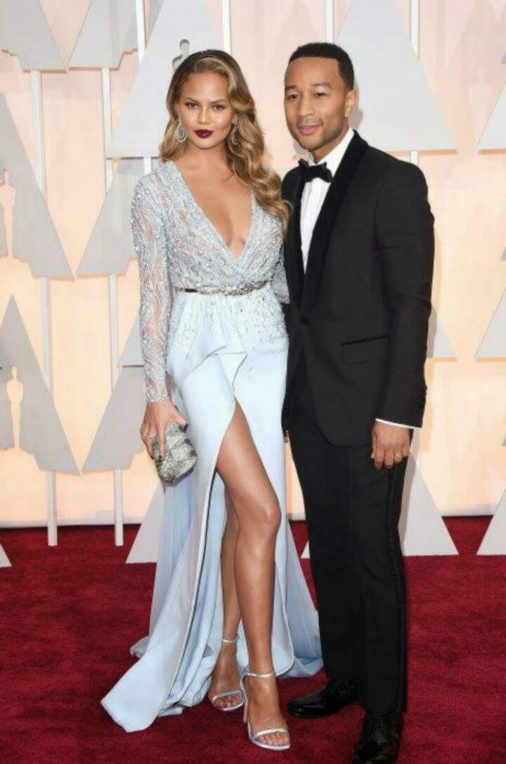 The power couple looked dazzling. John in his Tax and bow tie, whats with men and tuxedos is it just me or they look devine, anyway and our dear Chrissy rocking that frozen blue colored dress with killer cleavage and with sparkles and pearls on the dress and a sexy slit on the side front exposing her legs and the shoe being comfortable yet adorable and the red lipstick complimenting it, It was a yes and matched the saying “DRESSED TO IMPRESS”