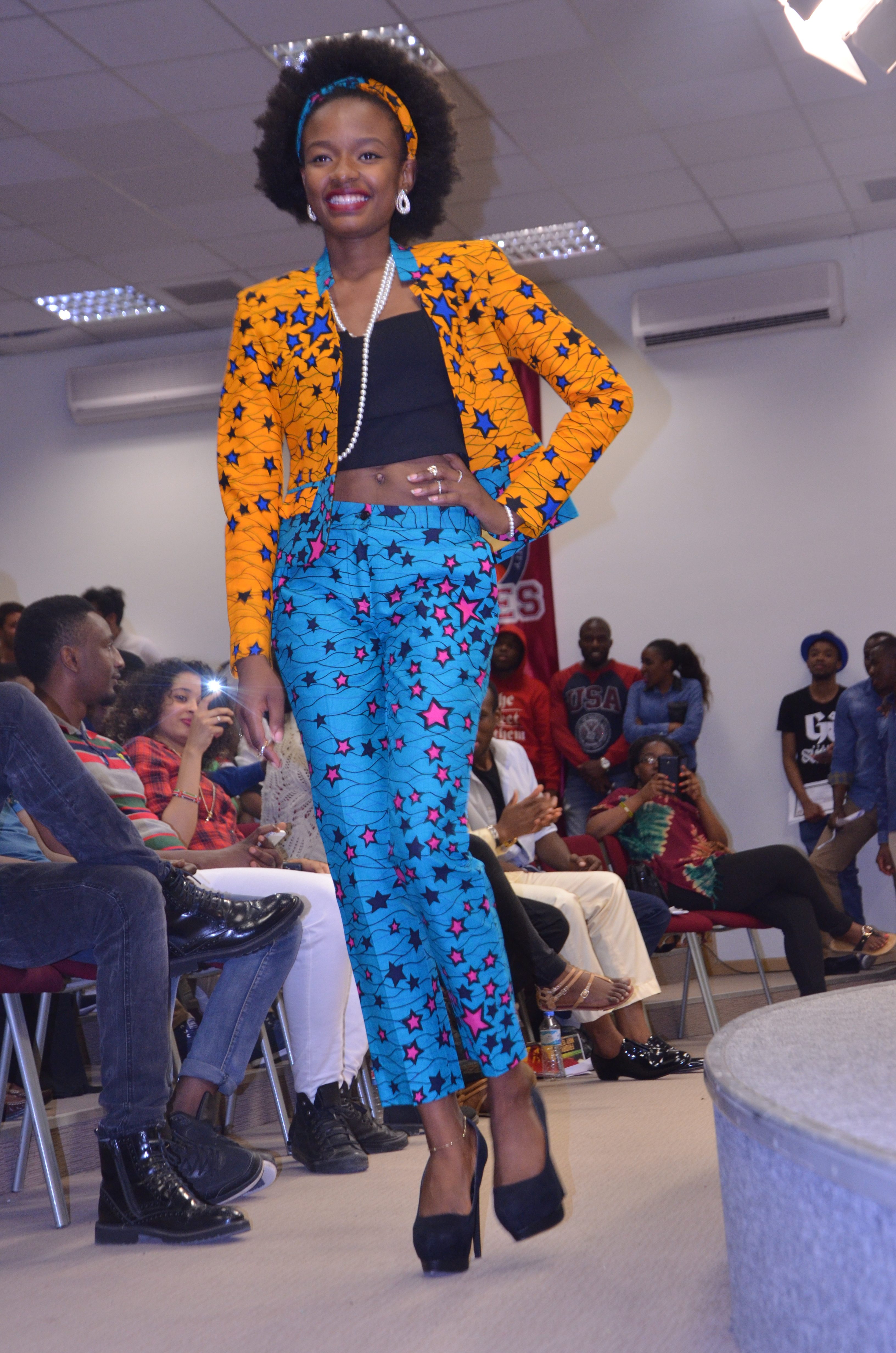 Dressed in an african print with an old school theme from the 80s styled hip star pants and jacket.. and the afro.. OMG#this was a total delightful look and the pumps were awesome as well on her. @salsa
