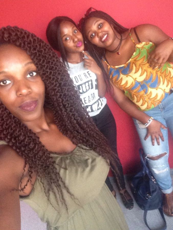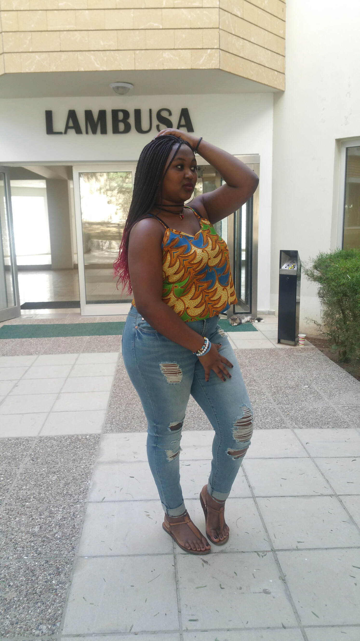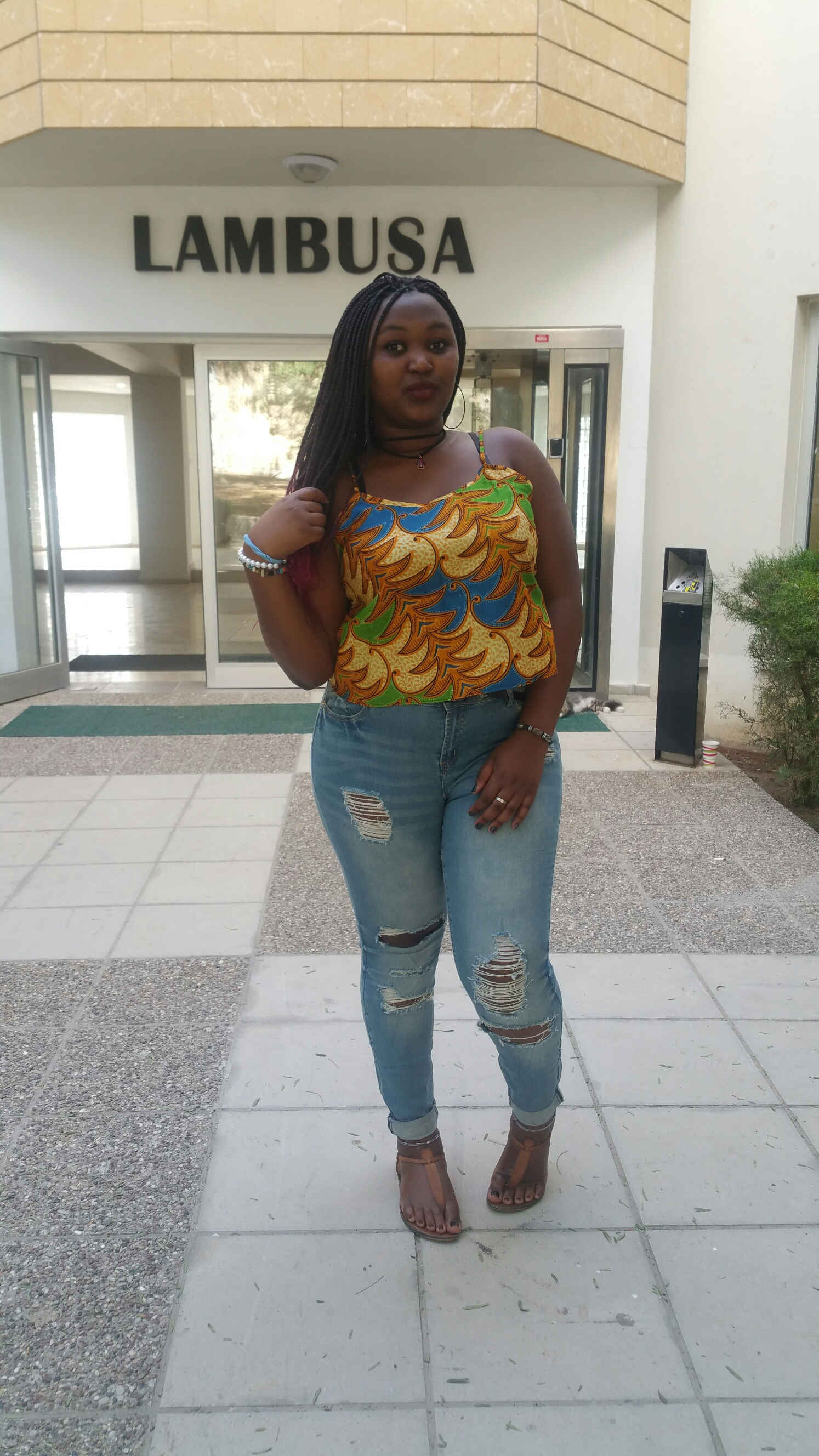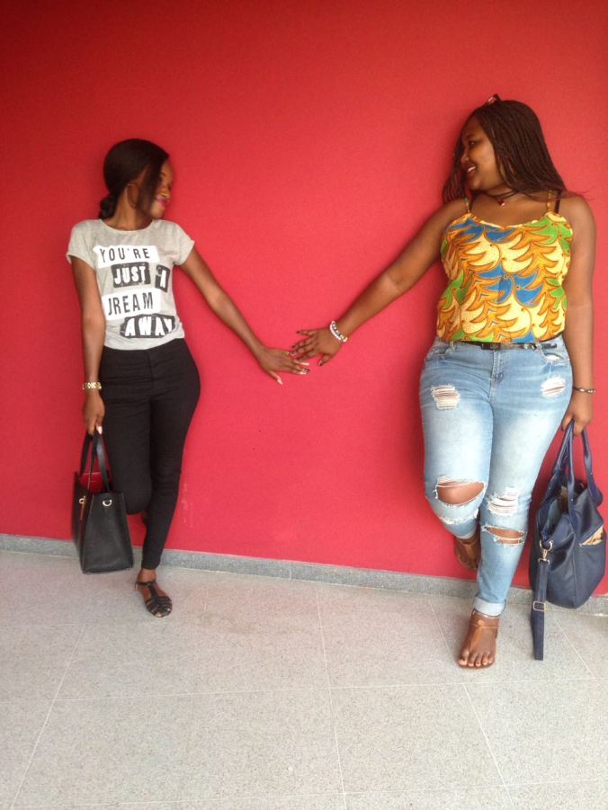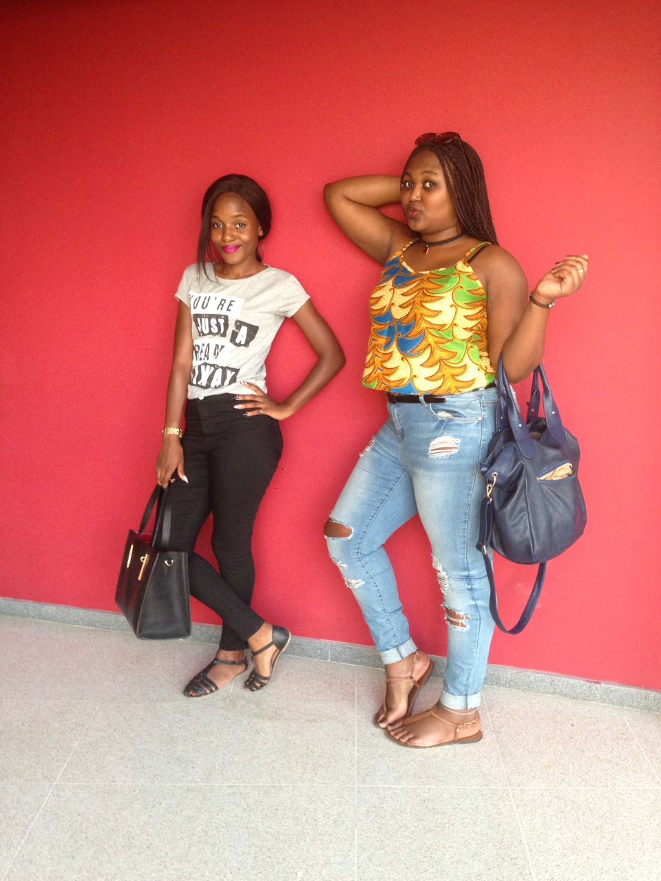 Dresses in An african print top and some buggy ripped jeans a pair of brown flat samdals and my navy blue bag and Alie in a tshrt and some plane black jeans with black flats and a black bag.