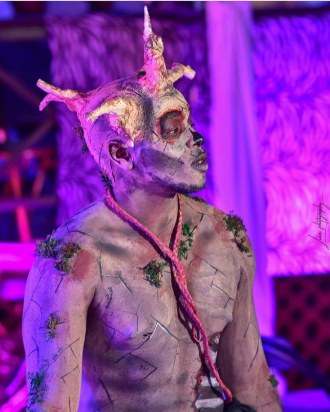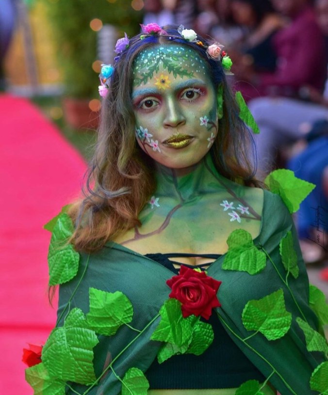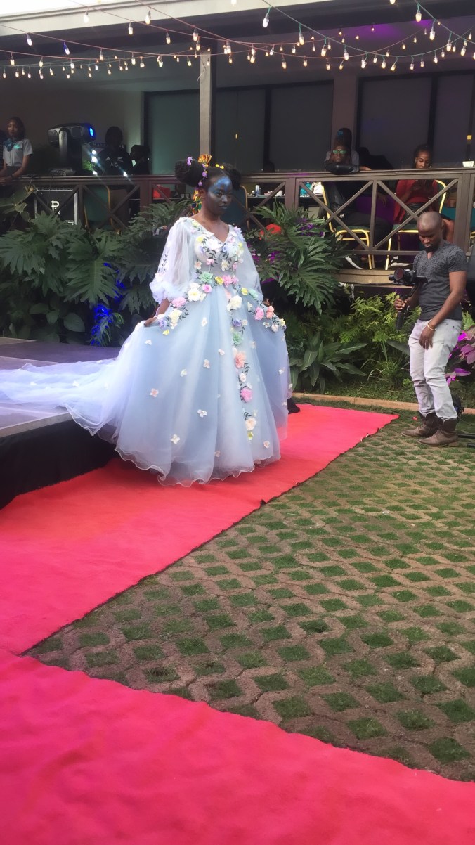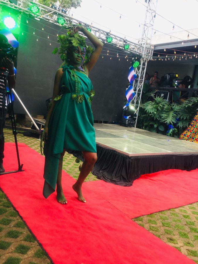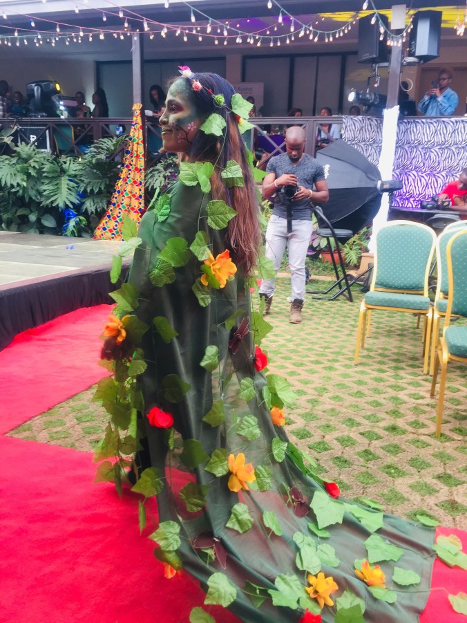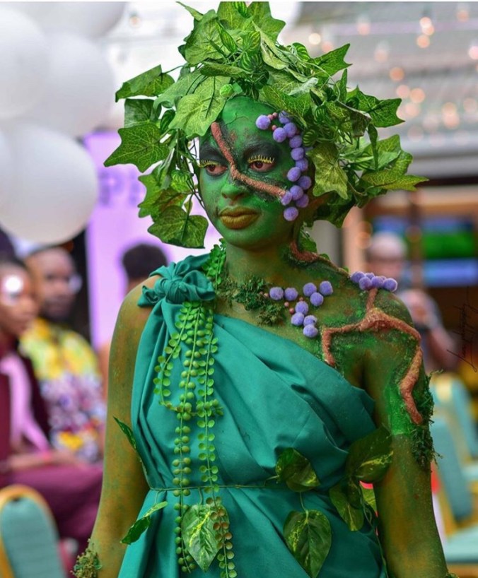 this was also her second showcase, still on the matter of climate change inspiration, here she went for a deforestation look, showing its impact to the earth thats the bald cap and its brunches that are lifeless showing how earth is after deforestation takes place, the presenter even threw inn “if dry spell was a person” this is wha it would look like and am sure we all agree